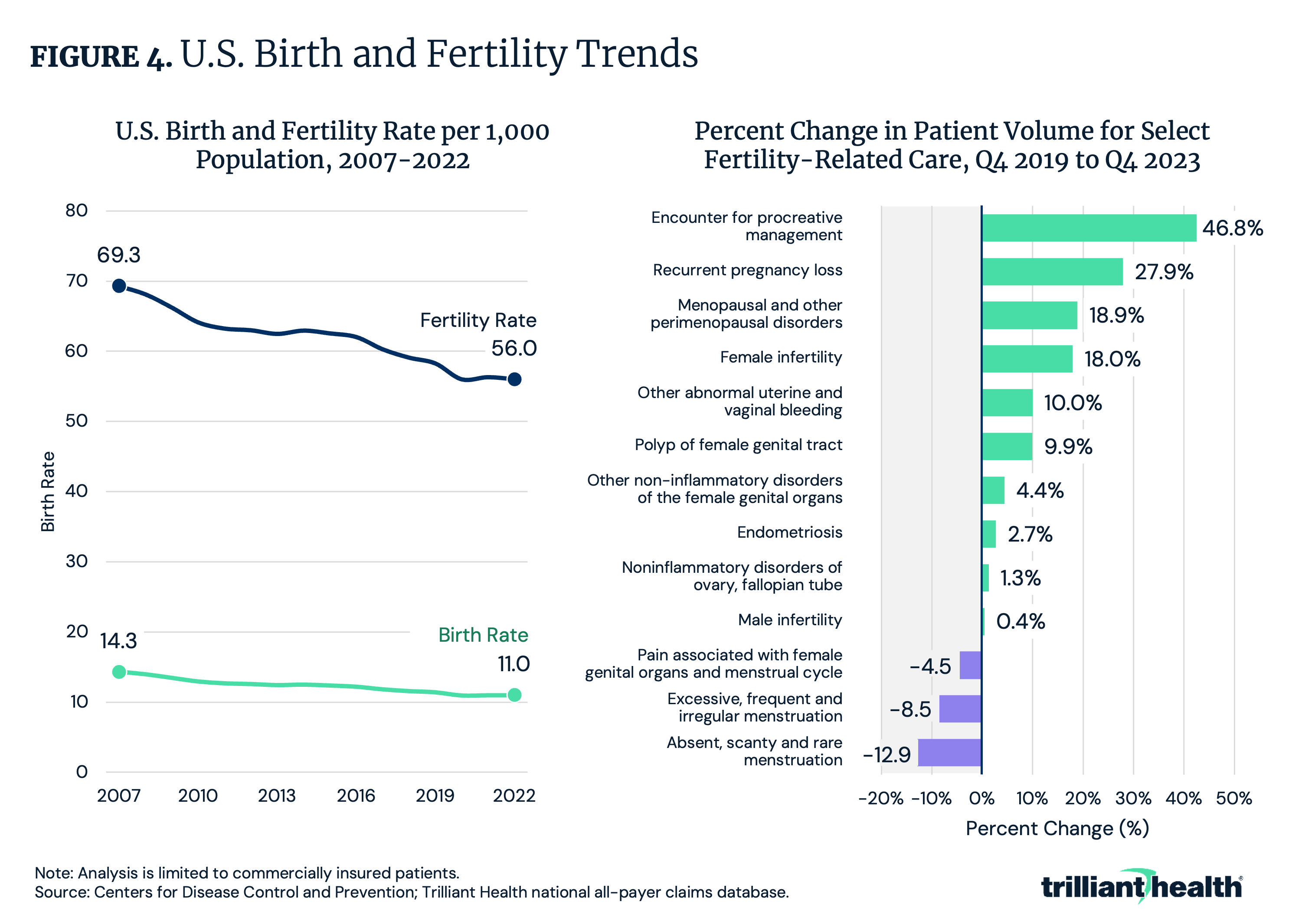 - Despite a declining birth rate, patient volume for fertility-related care has risen from Q4 2019 to Q4 2023, with significant increases in encounters for procreative management (+46.8%), recurrent pregnancy loss (+27.9%), menopausal and perimenopausal disorders (+18.9%), and female infertility (+18.0%).