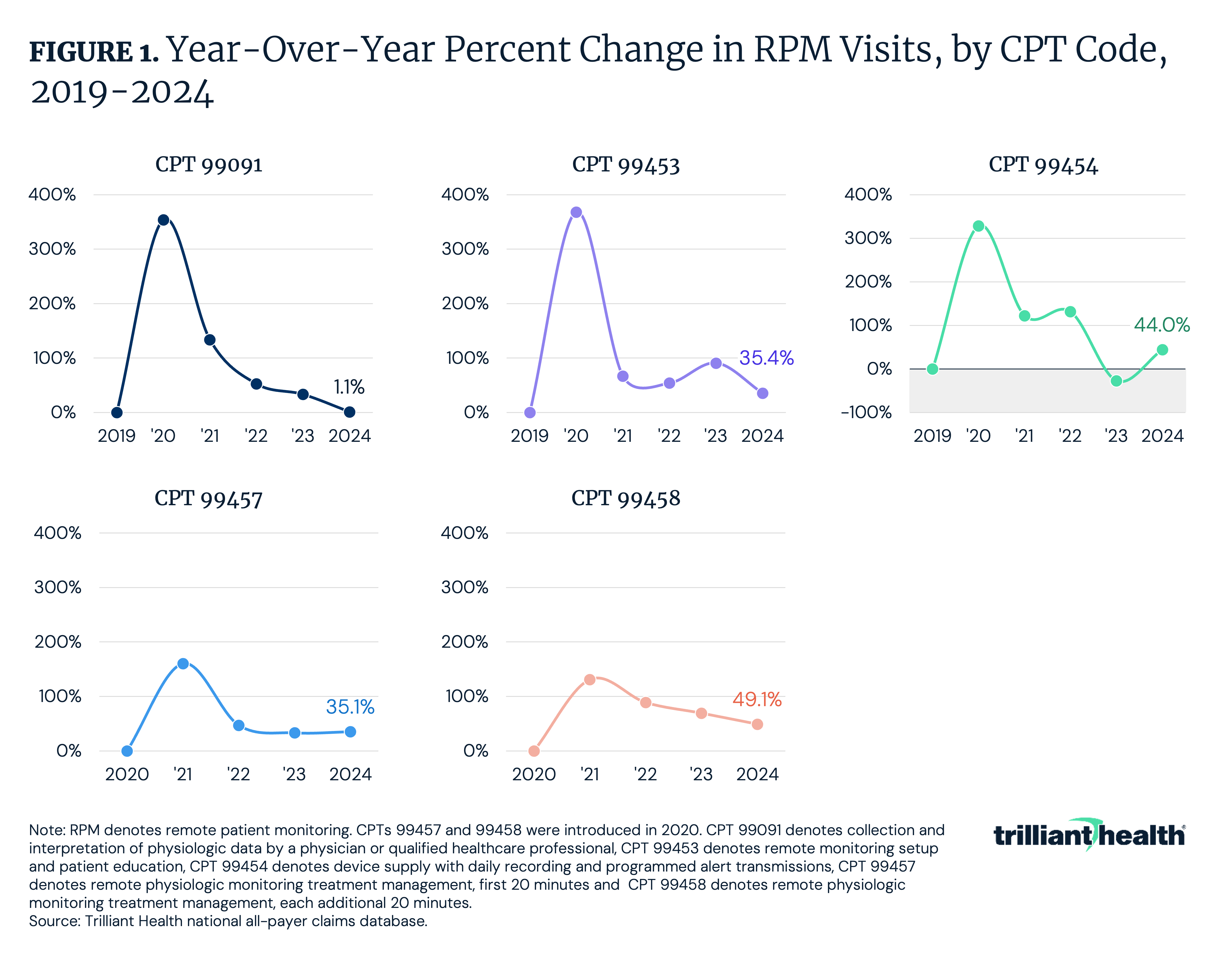- Remote patient monitoring (RPM) utilization growth has decelerated in recent years. Among codes introduced prior to 2020 (CPTs 99091, 99453 and 99454), year-over-year growth averaged 350% among the three codes from 2019 to 2020 before slowing steadily through 2024.