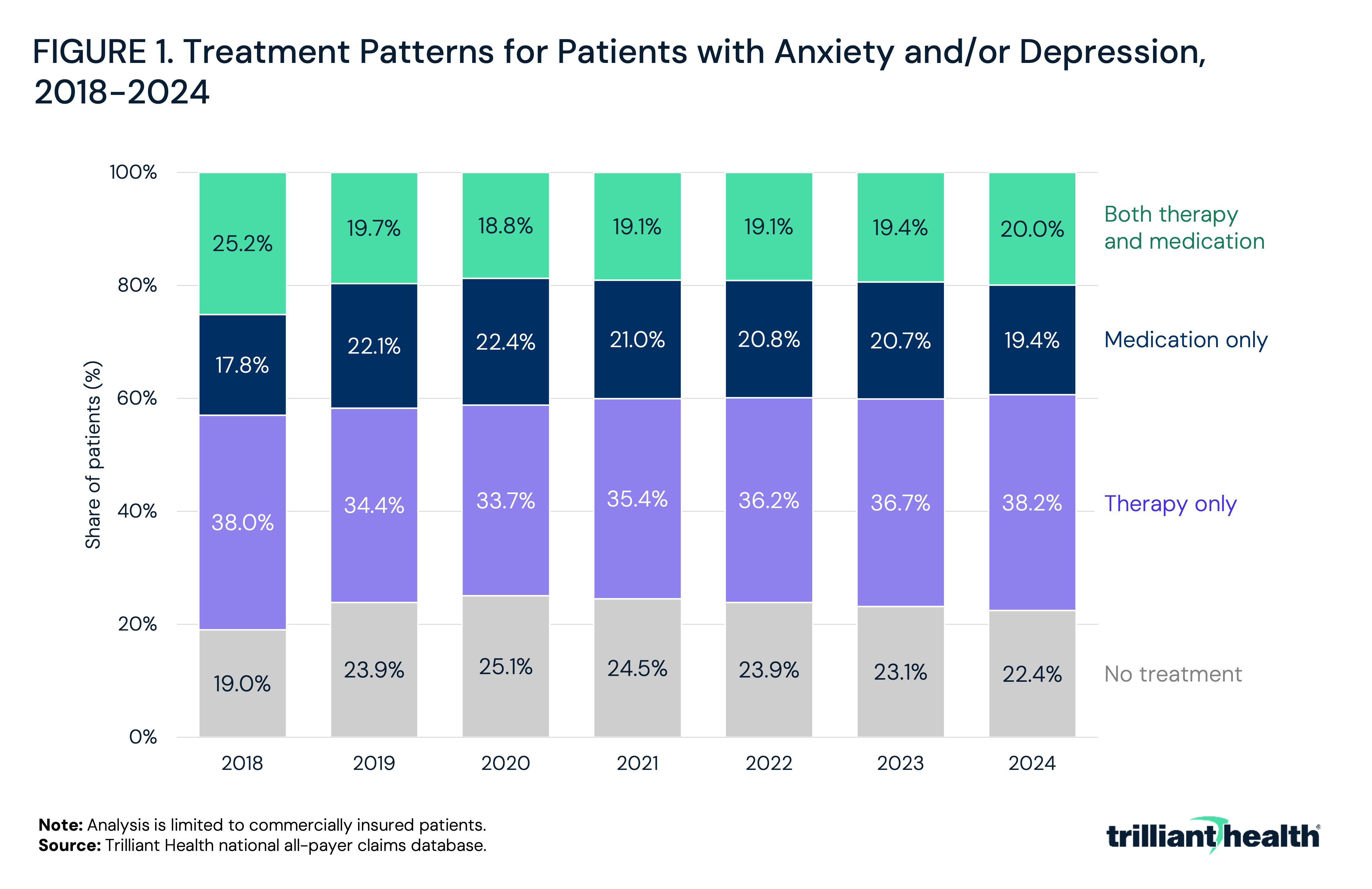 - From 2018 to 2024, the share of patients with anxiety and/or depression not receiving treatment increased from 19.0% to 22.4%, peaking at 25.1% in 2020. Over the same period, the proportion of patients treated via medication only increased from 17.8% to 19.4%.