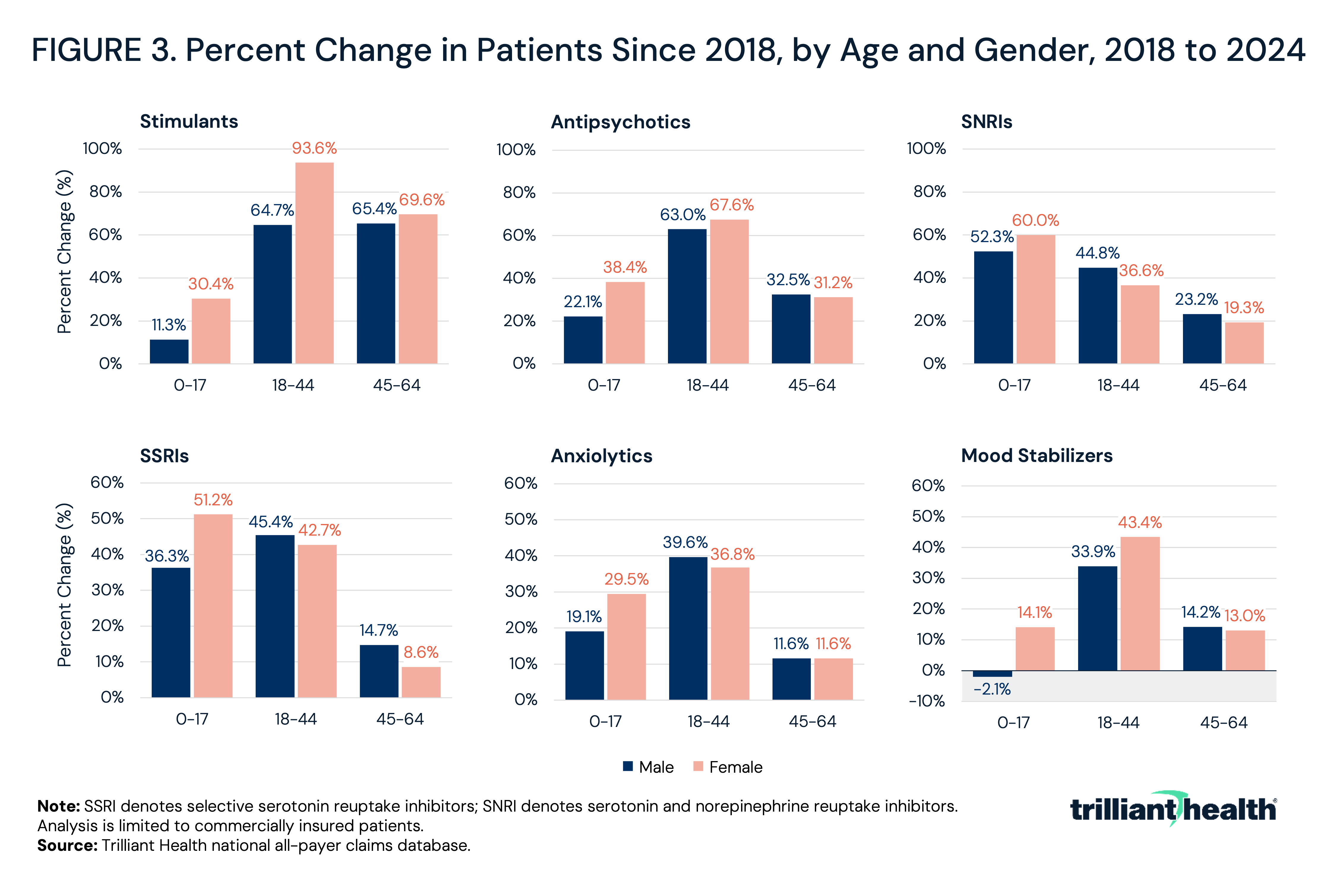 Growth in patient volume was generally higher across behavioral health medication classes from 2018 to 2024, with rates varying across classes by age and sex. Growth in stimulant use was particularly pronounced among women ages 18-44 (93.6%) (Figure 3). For anxiolytics, percent increases ranged from 39.6% among men ages 18-44 to 11.6% among men and women ages 45-64. Except for a slight decline among adolescent males, patient volume for mood stabilizers increased across all categories of age and gender, increasing the most (43.4%) among women ages 18-44.