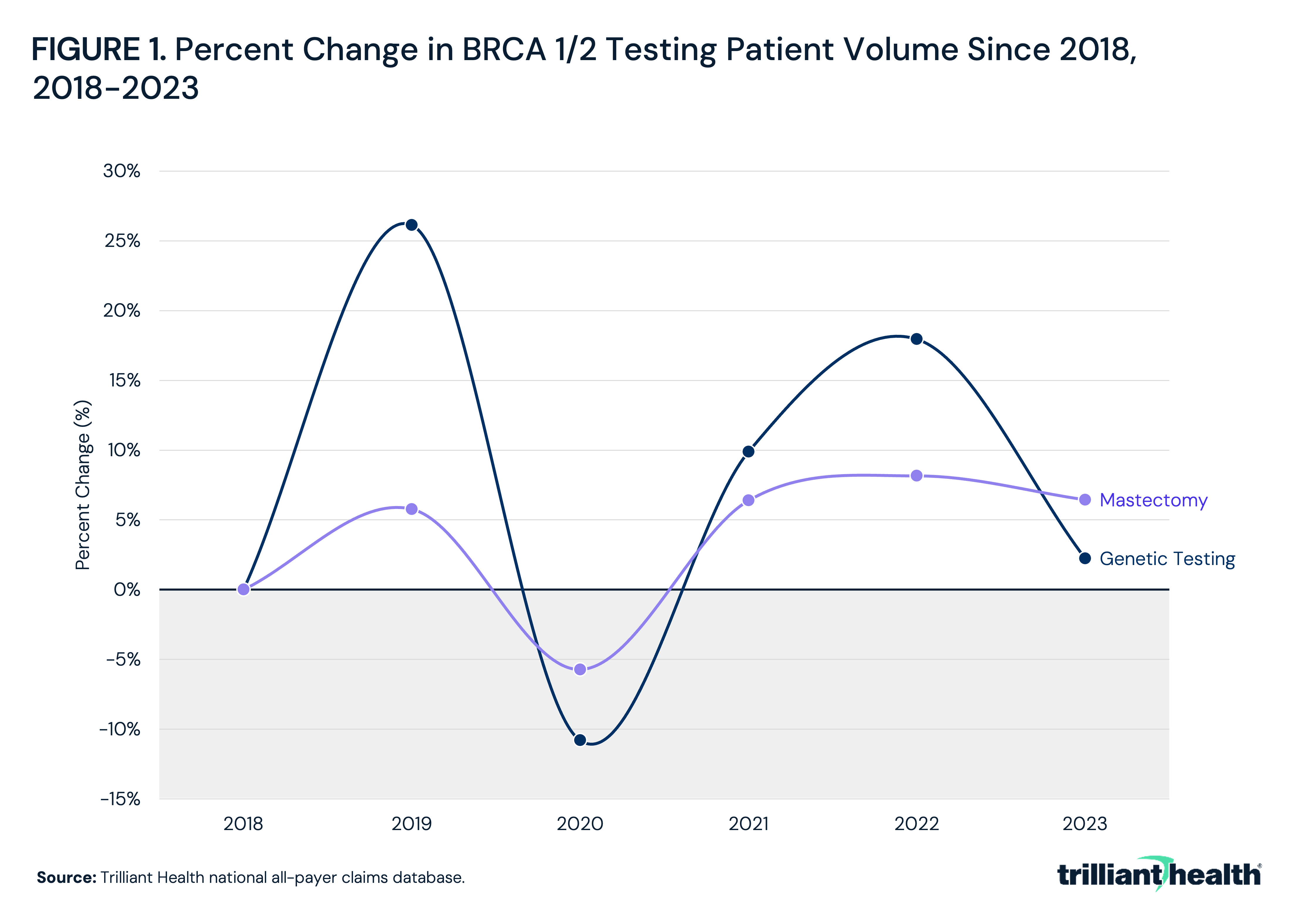 - BRCA1/2 genetic testing volume increased by 26.1% from 2018 to 2019 and 18.0% from 2018 to 2022.