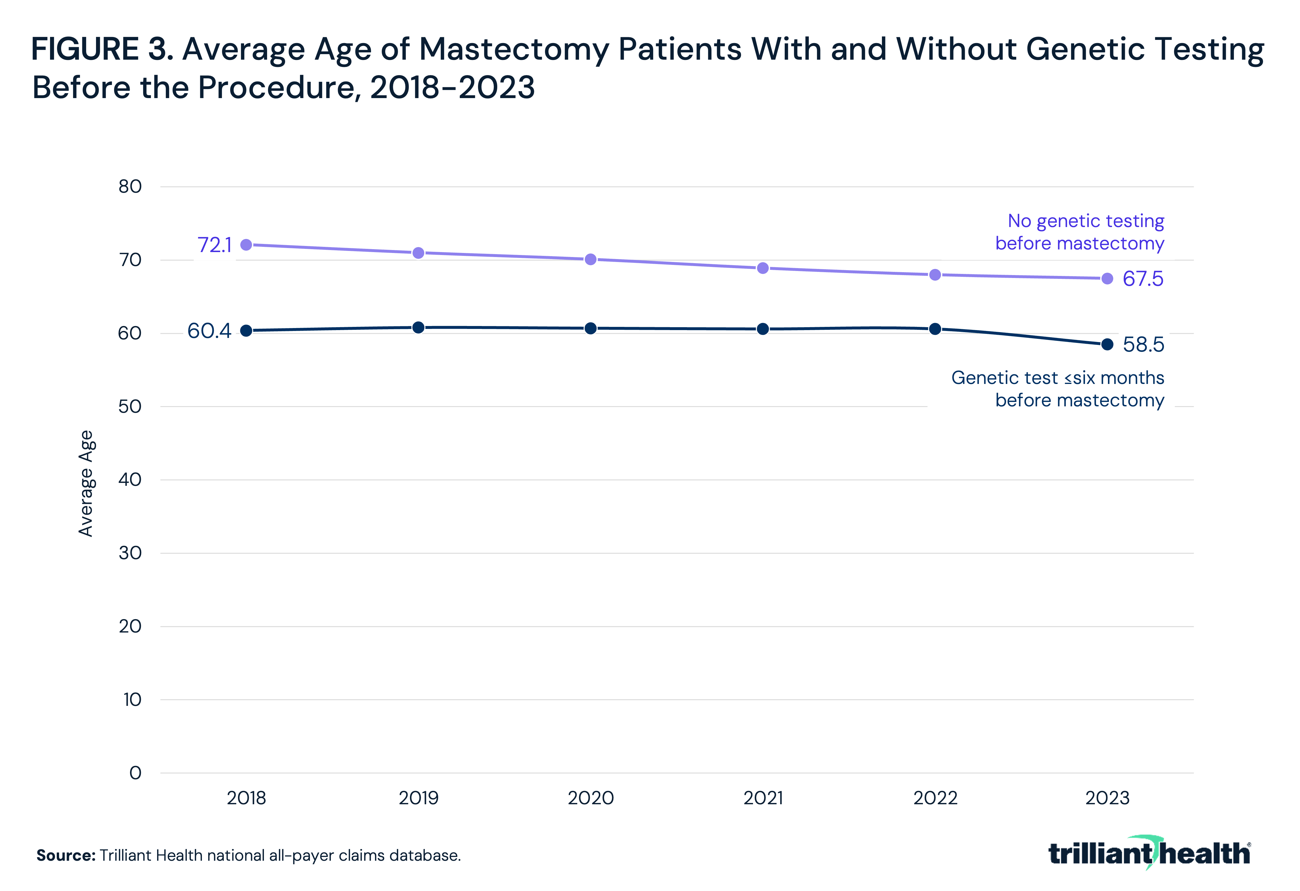 - Mastectomy patients without genetic testing were consistently older, with average age declining from 72.1 in 2018 to 67.5 in 2023.