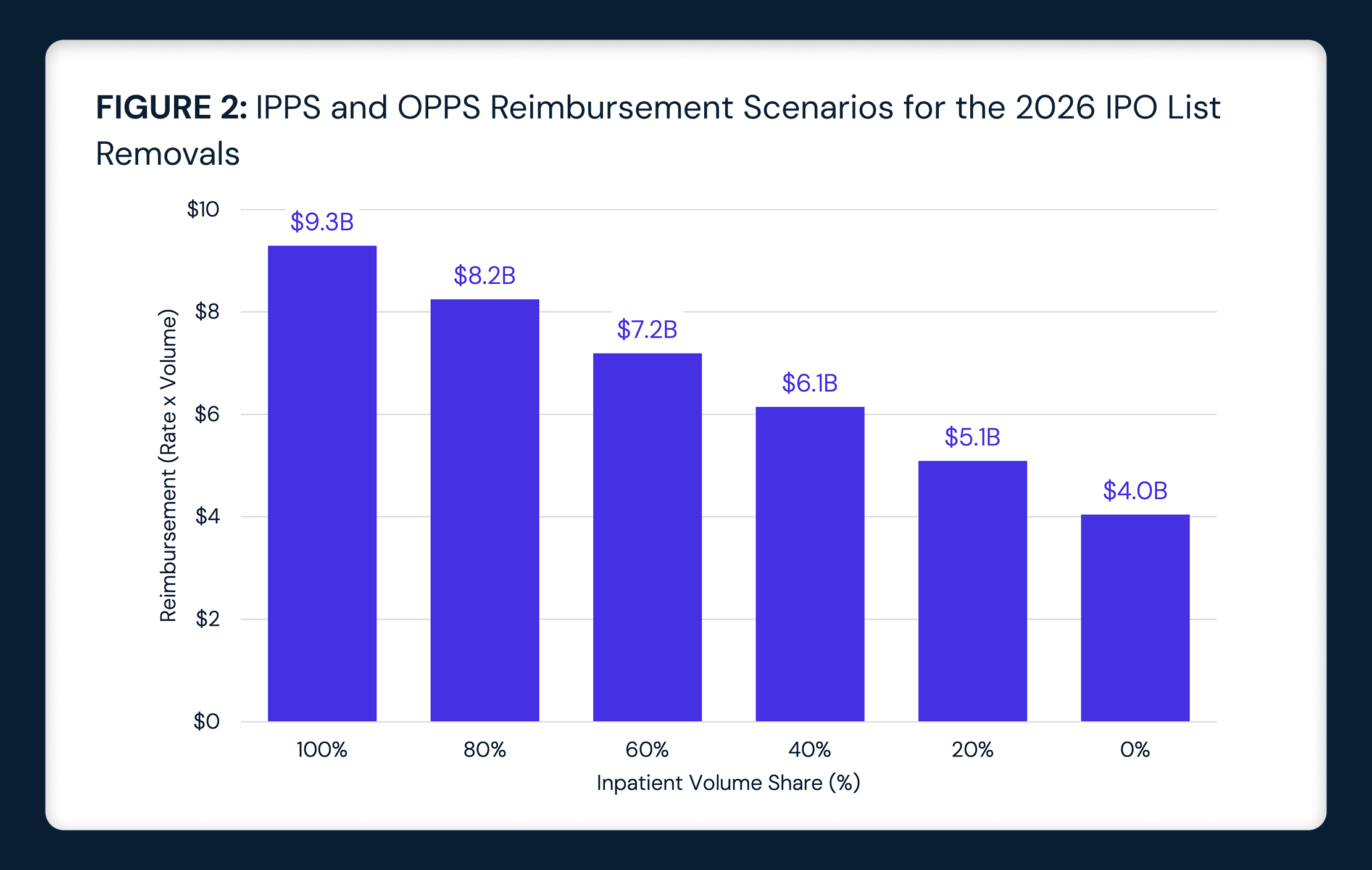 If finalized, the policy is expected to accelerate the shift of surgical care from inpatient to HOPDs and ASCs. While hospitals’ operational responses will vary based on local infrastructure and operational viability, the financial implications are broadly anticipated to include a decline in inpatient revenue. Medicare patient cost-sharing is not expected to increase under the proposal, due to existing protections that cap out-of-pocket costs in outpatient settings. Commercial payers and Medicare Advantage plans, drawing on the IPO list’s historical influence over site-of-service determinations, are also likely to encourage more aggressive shifts to outpatient care in response to the policy. In inpatient settings, Medicare reimburses approximately $18,000 for joint replacements, compared to $10,500 in ASCs, a meaningful difference for high-volume procedures like TKA and THA, for which aggregate annual volume approaches 800,000 procedures.