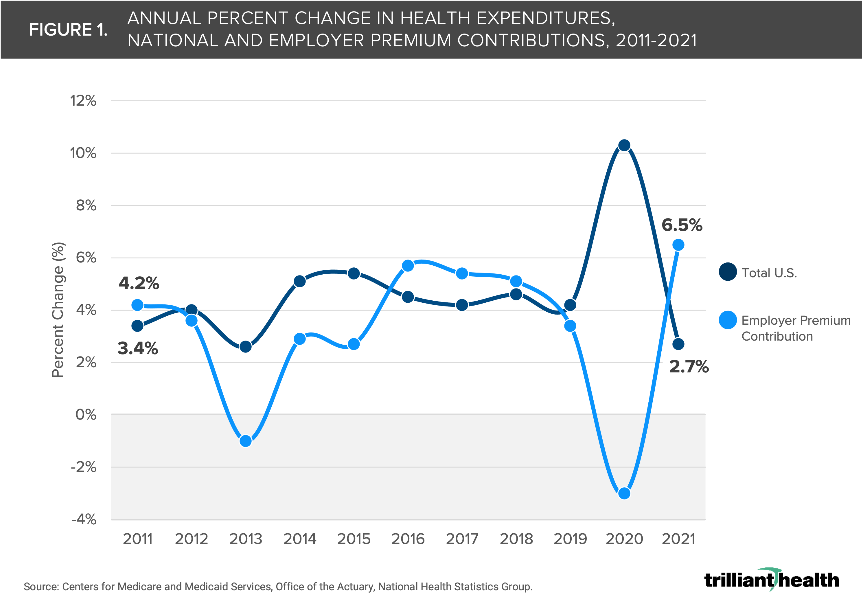 Spending on healthcare by private businesses increased by 6.5% in 2021 to $734B, which represents 17.1% of total U.S. health expenditures. Of that $734B, 75.4% was allocated to contributions for employer-sponsored health insurance premiums. Moreover, spending on premium contributions alone increased by 35.4% from 2011 to 2021, even with a 2.9% decline from 2019 to 2020. Recent trends indicate that future employer expenditures may once again surpass year-over-year growth in total U.S. health expenditures, a trend that began in 2016 (Figure 1).