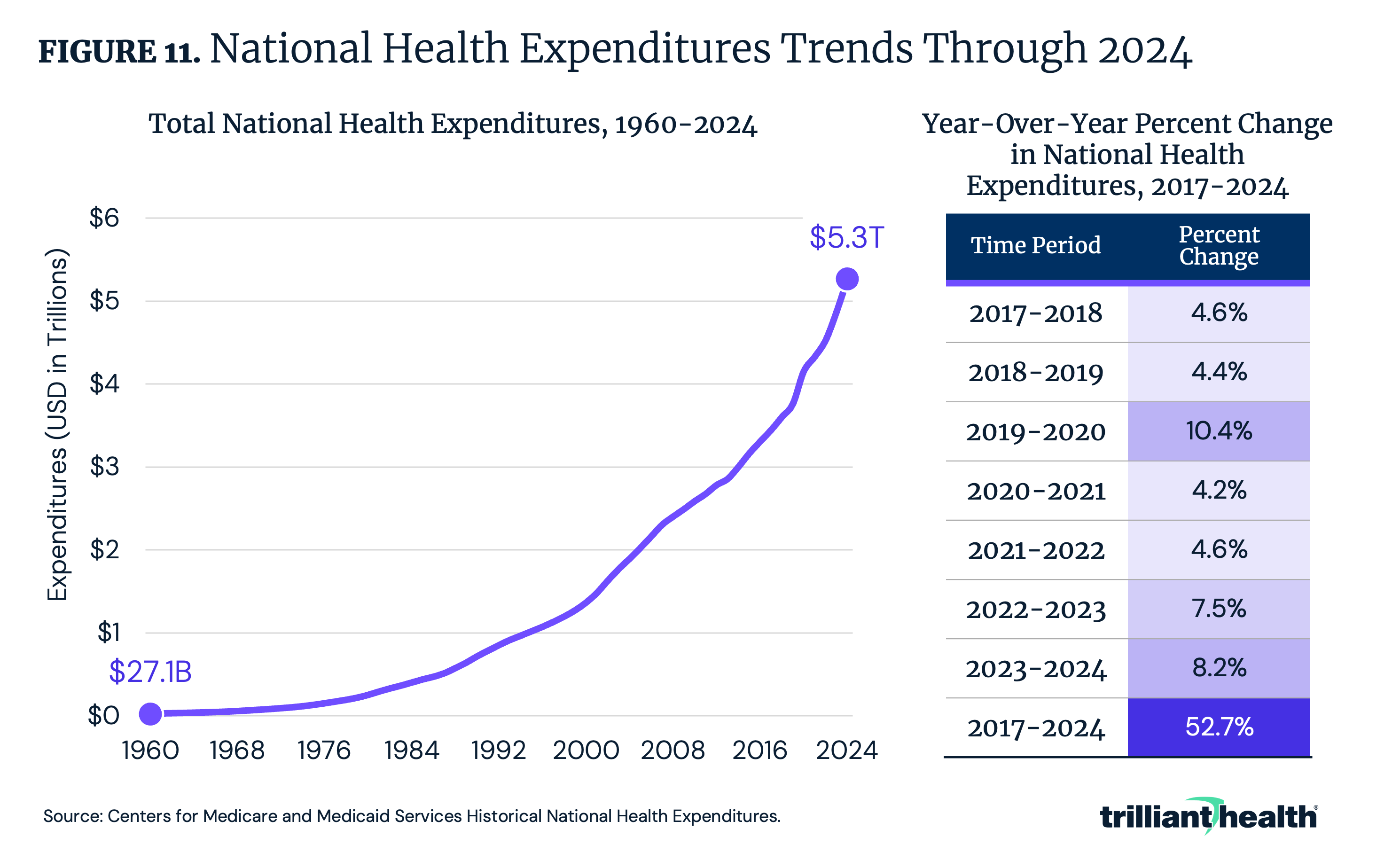 Between 1960 and 2024, NHE increased by 19,306.1% from $27.1B to $5.3T (Figure 11). Between 2018 and 2024, the year-over-year growth ranged from 4.2% between 2020 and 2021 to 10.4% between 2019 and 2020. Despite a decline in healthcare utilization amid the COVID-19 pandemic, spending growth increased disproportionately from 2019 to 2020, compared to the years immediately before and after.