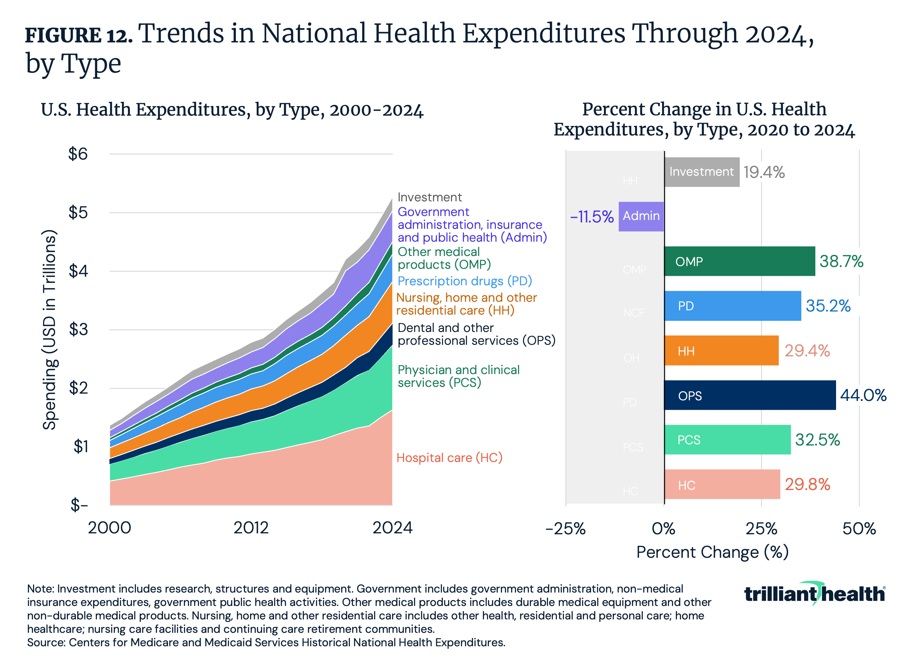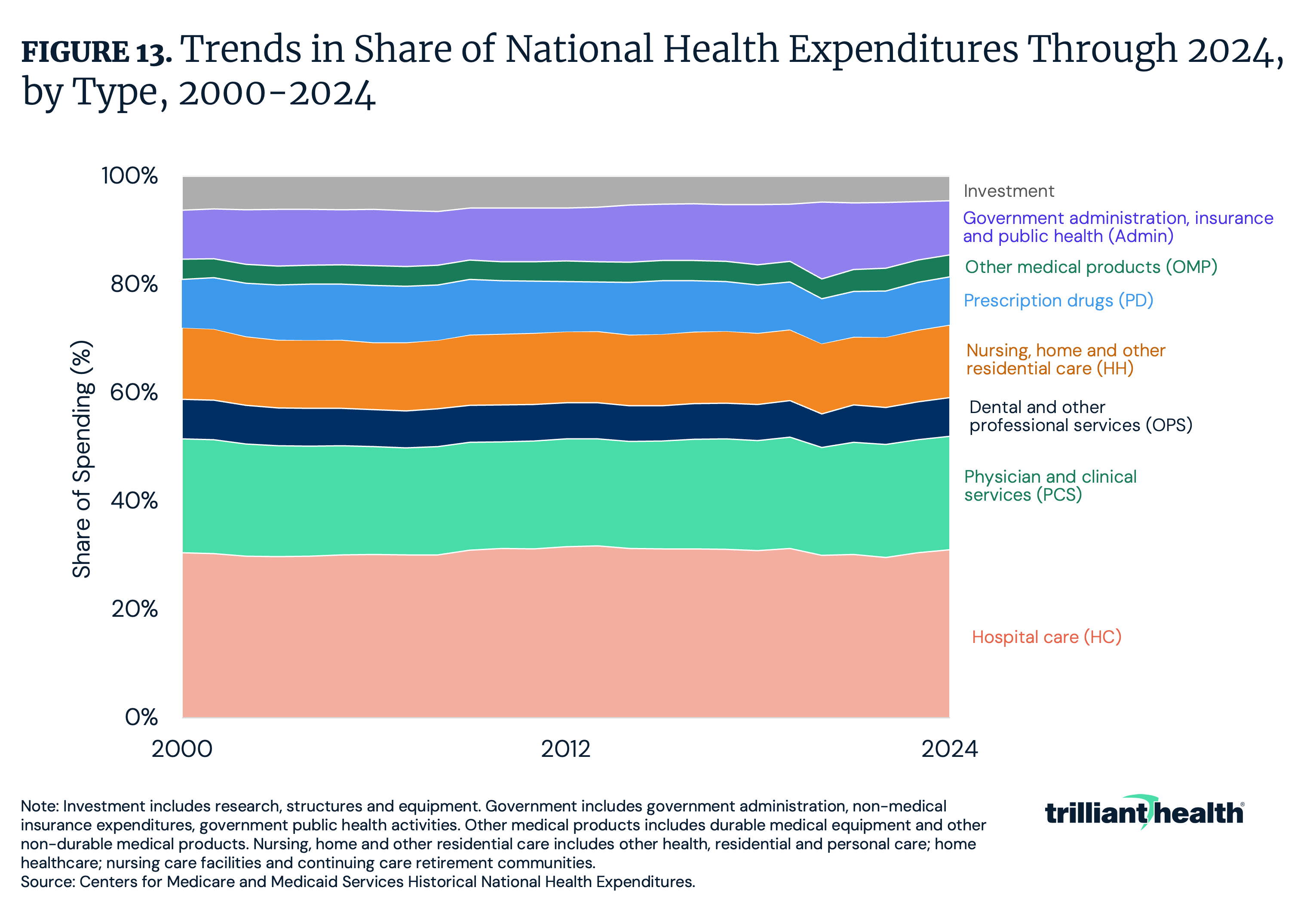 Hospital care, physician and clinical services and nursing, home and other residential care consistently account for the largest share of spending, totaling $1.6T, $1.1T and $709.8B, respectively, in 2024 (Figure 12). Notably, spending on hospital care, physician and clinical services and nursing, home and other residential care have grown 29.8%, 32.5% and 29.4% between 2020 and 2024, respectively. Meanwhile, spending on other professional and dental services – care that excludes hospital and physician services – has grown the most, increasing by 44.0% between 2020 and 2024. Spending on other medical products also grew during the same period (38.7%), outpacing prescription drugs (35.2%).