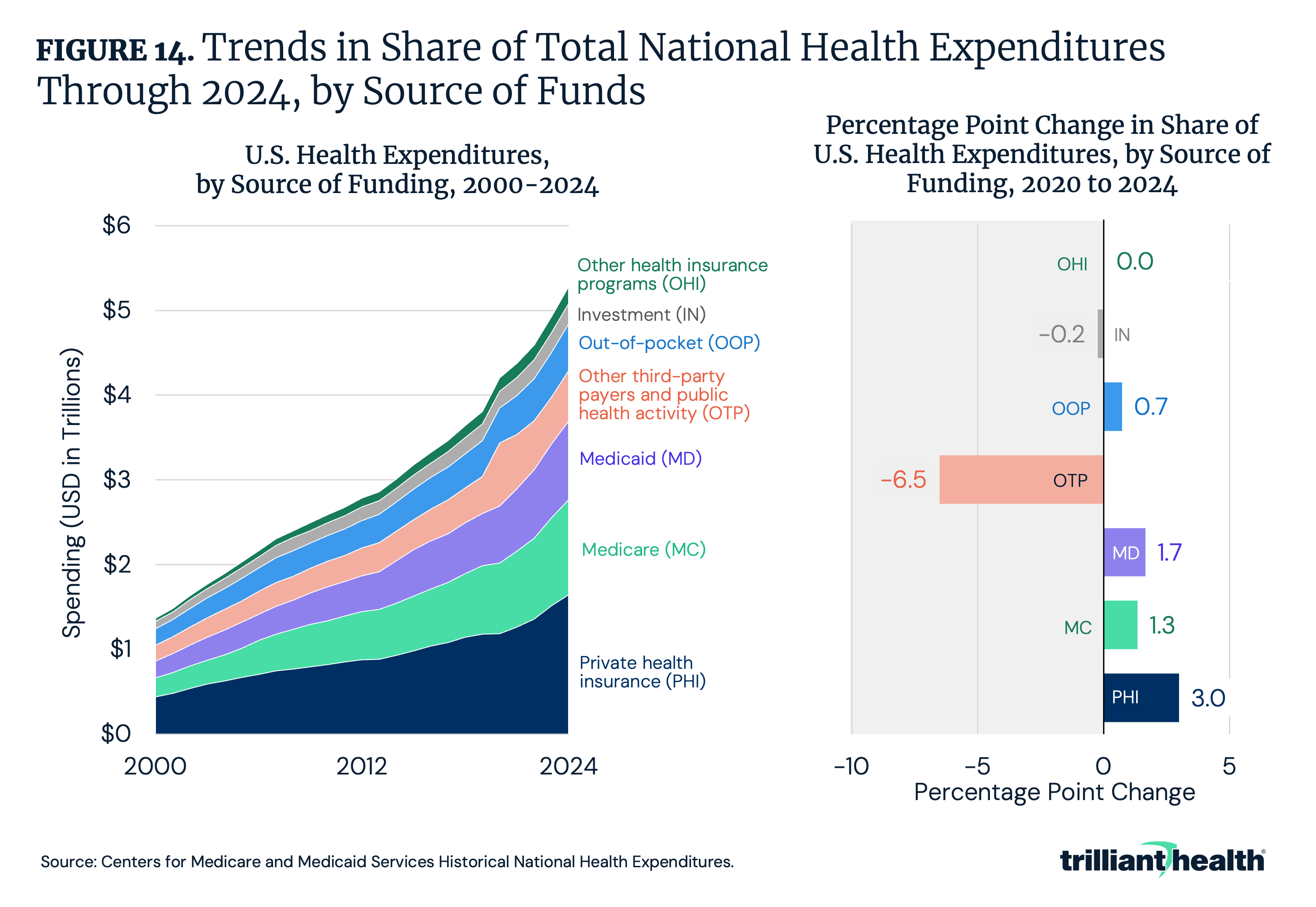 As spending allocation shifts across healthcare services, it is important to examine who is financing this care. Private health insurance accounted for the largest share of healthcare spending in 2023, representing 31.2% of total spending, followed by Medicare at 21.2% (Figure 14). Between 2020 and 2024, private health insurance’s share of total healthcare spending increased most, rising by 3.0 percentage points, while share attributed to other third-party payers and public health programs – including worksite healthcare, Indian Health Services, workers' compensation and other Federal and state programs – declined by 6.5 percentage points.