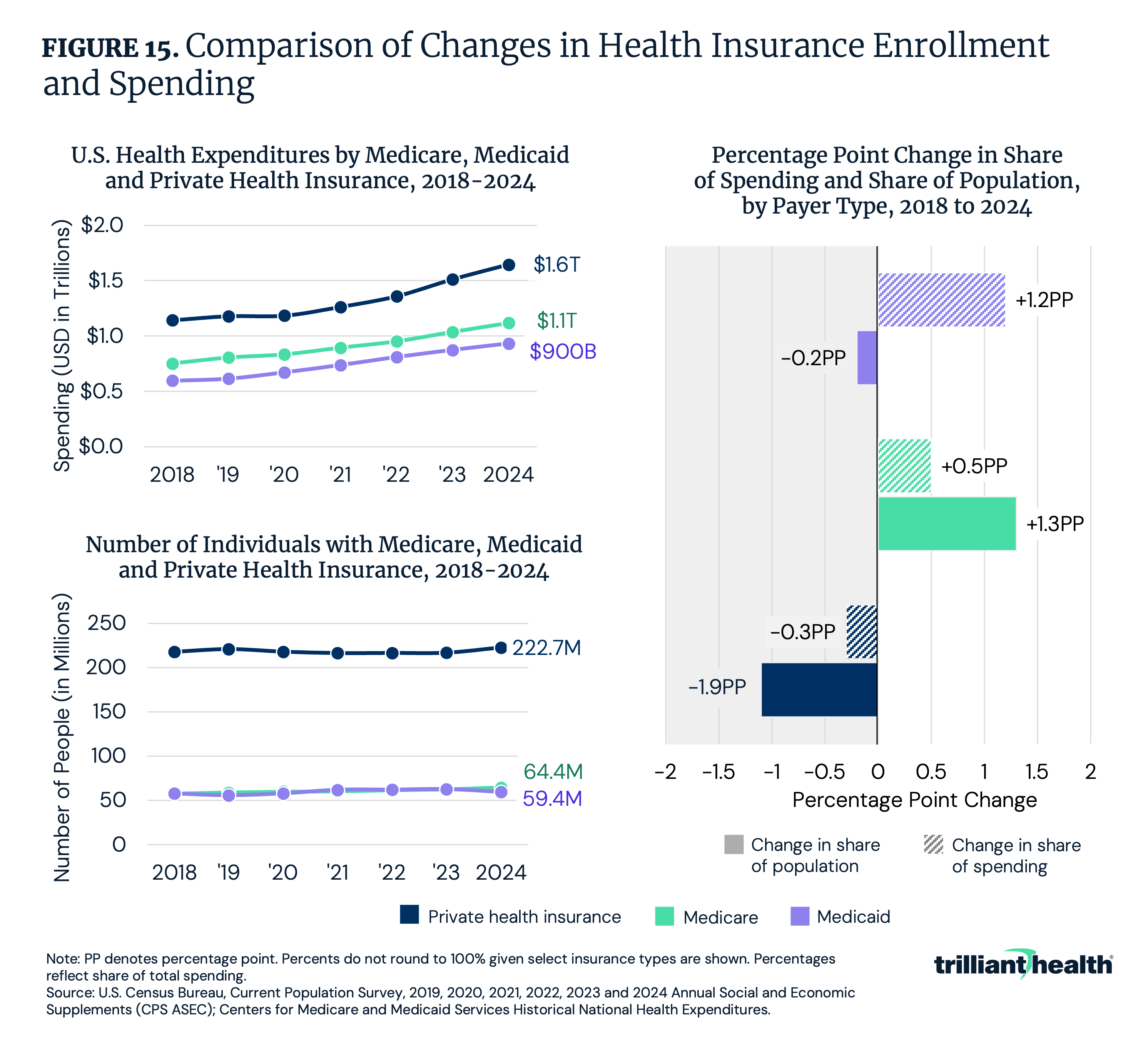 Changes in insurance coverage and reimbursement levels play a critical role in determining how healthcare costs are distributed across the system. In recent years, private insurers have accounted for a growing share of total expenditures despite relatively modest enrollment growth. Between 2018 and 2024, spending growth outpaced enrollment growth for private health insurance, with spending rising 43.9%, compared to 2.3% for enrollment. Similarly, Medicaid spending grew 56.1% compared with 2.8% enrollment growth. Medicare spending increased 48.7%, while enrollment grew 11.5% (Figure 15). Moreover, between 2018 and 2024, the share of Americans covered by private health insurance declined by 0.2 percentage points, while the share of NHE attributable to private payers increased by 1.2 percentage points. During the same period, growth in the share of Americans covered by Medicare (0.5 percentage points) outpaced growth in the share of Medicare spending (1.3 percentage points). Inversely, the share of Americans covered by Medicaid decreased by 1.9 percentage points, with spending decreasing by just 0.3 percentage points. This trend underscores the wide disparity between commercial and government reimbursement rates, with commercial reimbursement rates ranging from 167% to 250% of Medicare rates for hospital services and 118% to 163% for physician services.14 Consequently, commercially insured patients produce a disproportionate amount of revenue in the health economy, serving as a crucial financial source for providers, payers, life sciences and more. As growth in the commercially insured population slows, stakeholders across the health economy could see revenues decline. In turn, coverage shifts have significant implications for the financial performance and viability of all healthcare stakeholders.