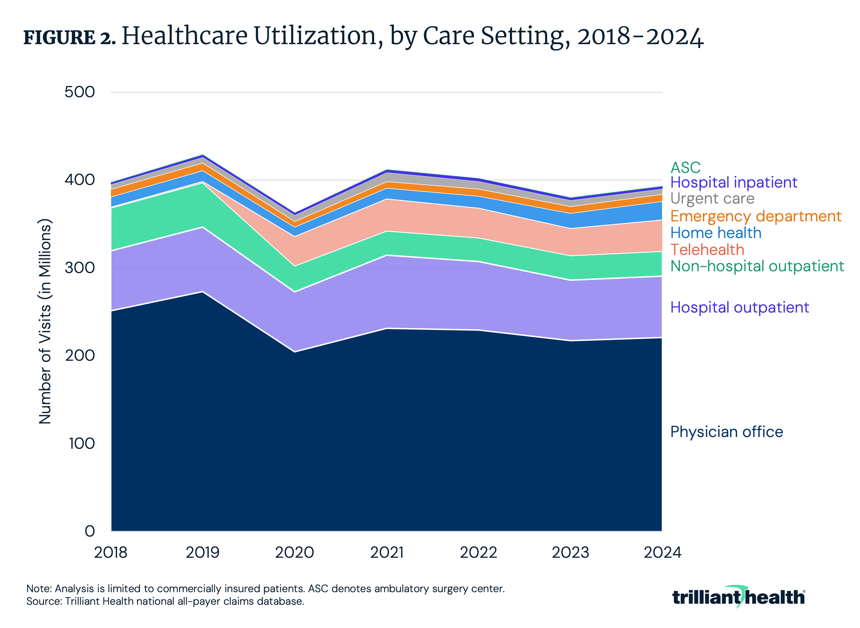 Healthcare spending has grown disproportionately compared to trends in healthcare utilization. While healthcare utilization increased by 3.6% from 2023 to 2024, overall visit volume in 2024 was 8.0% below 2019 and 0.8% below 2018 (Figure 2).