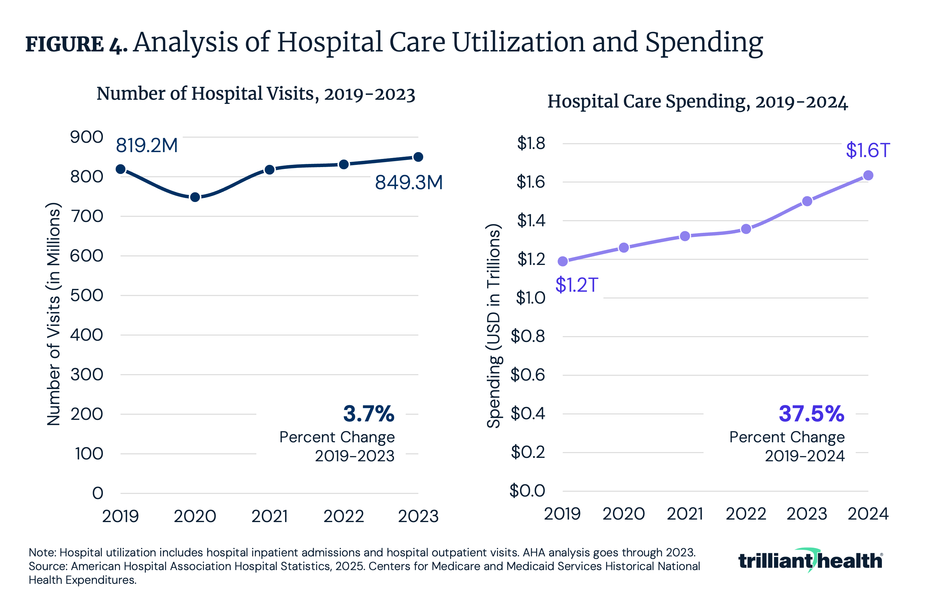 Against this longer-term backdrop, more recent trends show only modest changes in hospital volume. Between 2019 and 2023, inpatient and outpatient hospital volume increased by 3.7% (Figure 4). However, spending on hospital care disproportionately increased by 37.5% from $1.2T to $1.6T from 2019 to 2024. Notably, during the height of the COVID-19 pandemic, when non-emergent care was widely paused or delayed, hospital spending continued to grow. While the intensity of care provided during the COVID-19 pandemic might explain some amount of higher spending, it cannot fully explain the gap between the decline in utilization and increase in spending. Although care has shifted from resource-heavy inpatient stays toward lower-cost outpatient settings, total healthcare spending has continued to disproportionately increase, underscoring the growing influence of price and care intensity.