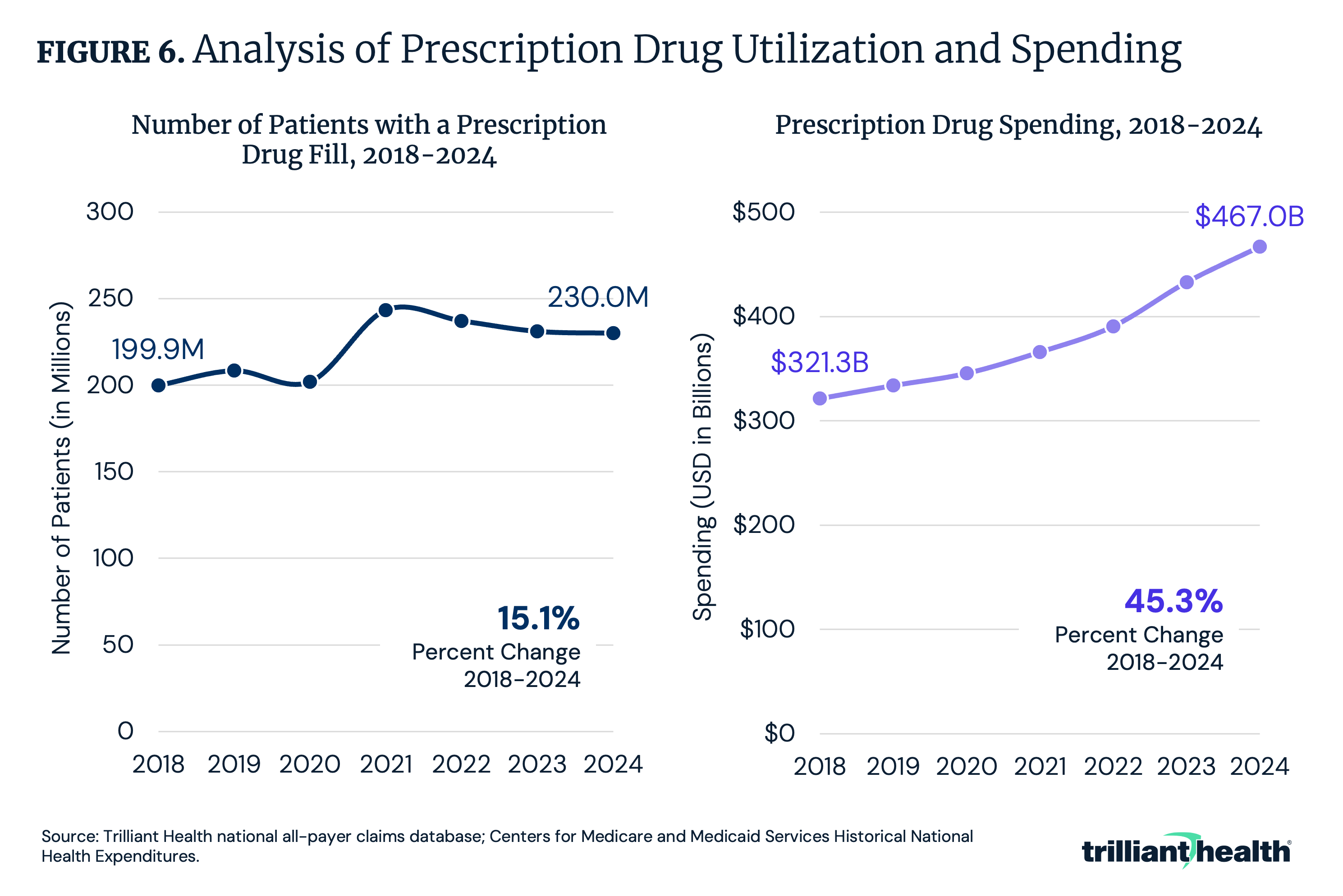 While medical utilization has remained relatively flat, prescription drug utilization and treatment intensity have increased, driven by the growing availability of novel therapies – particularly among older adults and patients with chronic conditions.6 Between 2018 and 2024, the number of patients with a prescription increased by only 15.1%, while prescription drug expenditures increased from $321.3B to $467.0B, an increase of 45.3% (Figure 6).