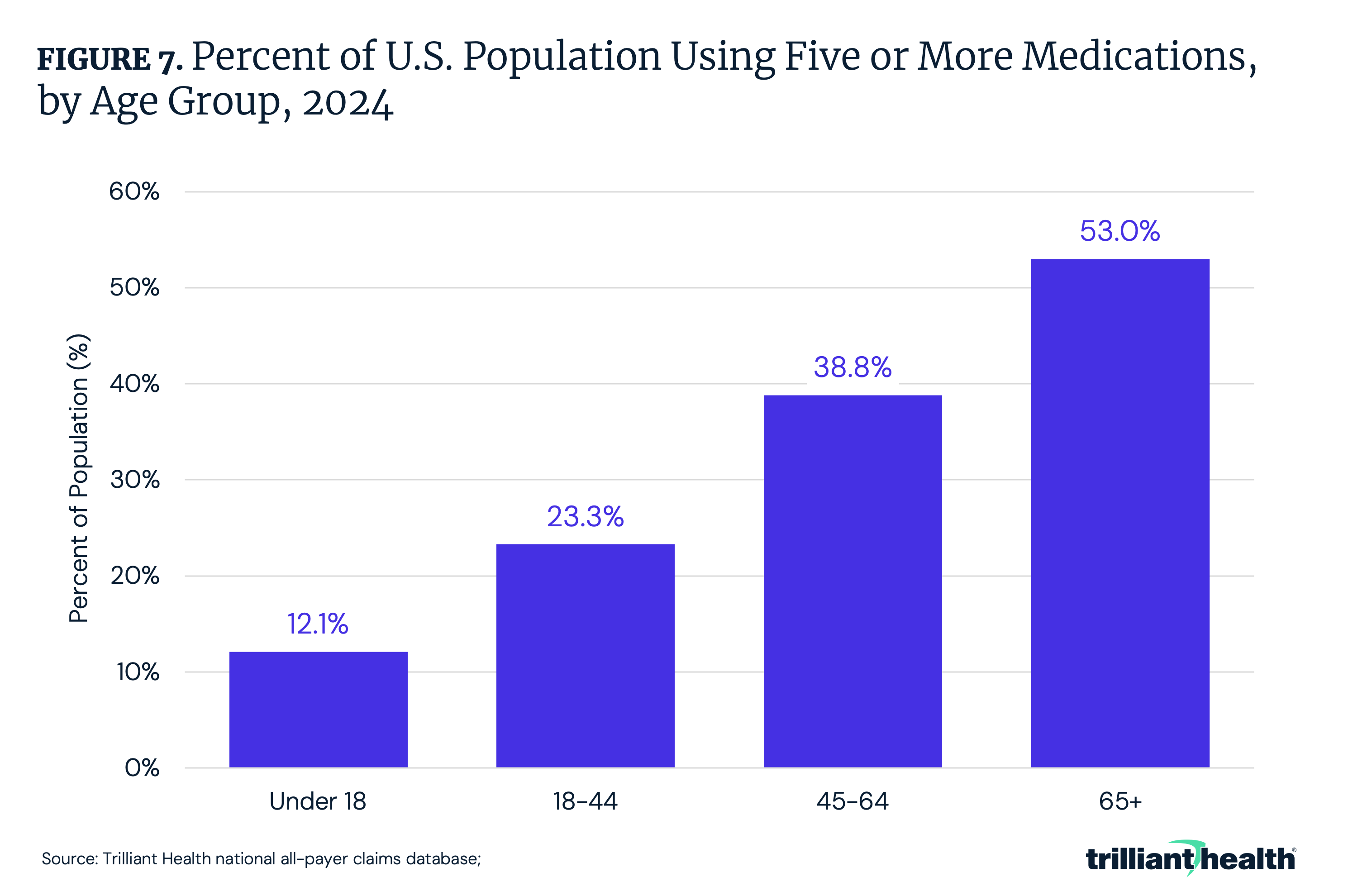 While spending growth and utilization are increasing disproportionately, this divergence reflects the combined effects of more medication use, and a shift toward higher-cost therapies. This comes in the form of higher rates of polypharmacy, expanded use of specialty drugs and broader adoption of novel therapies.7 For example, between 2018 and 2023, the number of patients using a GLP-1 medication increased by 744.6%.8 Additionally, as of 2024, 53.0% of adults ages 65 and older were prescribed five or more medications, followed by 38.8% of adults ages 45-64 (Figure 7).