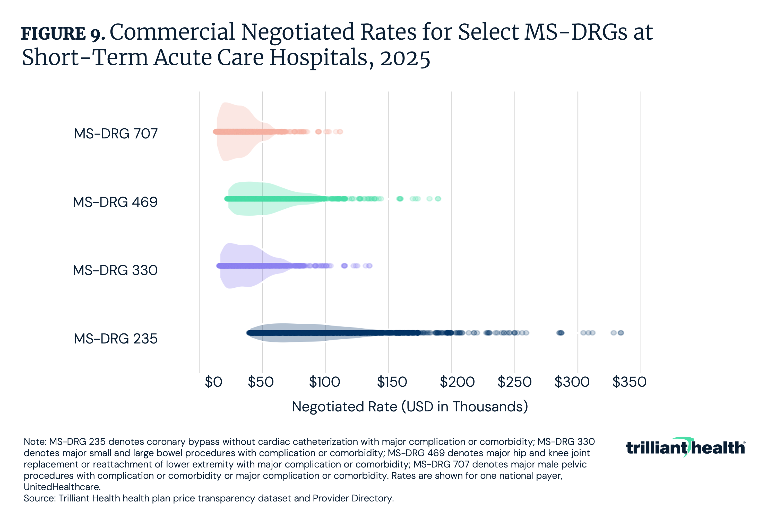 Across the U.S. healthcare system, prices for identical services vary substantially by provider, payer and geography. These disparities underscore the absence of uniform pricing standards and the central role of commercial rate negotiation in shaping spending levels. Within and across payers, negotiated rates have inexplicable variation that lead to higher costs and ultimately wasteful spending. Nationally, the commercial negotiated rates for four distinct MS-DRGs vary by a factor of 8.5x, on average. As an example, for coronary bypass without cardiac catheterization with major complication or comorbidity (MS-DRG 235), commercial negotiated rates for UnitedHealthcare (UHC) range from $39,579 to $334,147 (Figure 9).