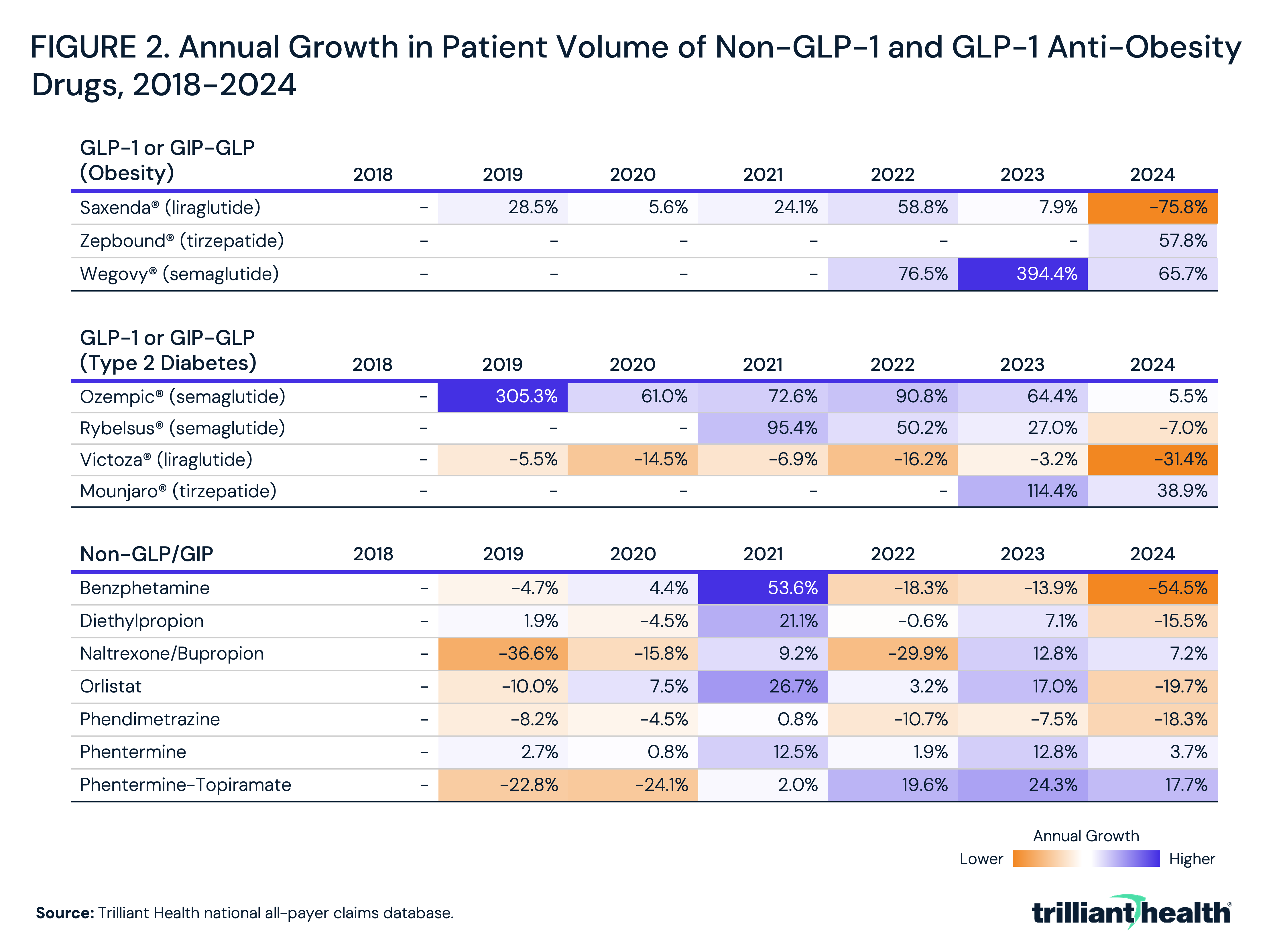 - From 2018 to 2021, prior to the approval of Wegovy® in June 2021, patient volume for anti-obesity therapies increased by 16.4%, compared to 94.5% from 2021 to 2024.