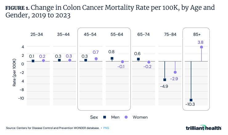 According to the CDC's WONDER database, the crude mortality rate for colon cancer in 2023 was 14.9 per 100K, slightly up from 14.7 per 100K in 2019. However, changes in mortality vary by age. For women ages 45 to 54, the mortality rate increased by 0.7 per 100K, while for men in the same age group, it increased by 0.3 per 100K (Figure 1). For men ages 55 to 64, the rate increased by 0.8 per 100K, but for women in this age group, it declined by 0.1 per 100K. The mortality rate increases for both men and women ages 25 to 34 and 35 to 44 ranged from 0.1 to 0.3 per 100K. Notably, while the mortality rate declined by 10.3 per 100K for women ages 85+, it increased by 3.8 per 100K for men ages 85+, despite declines for men and women ages 75 to 84.
