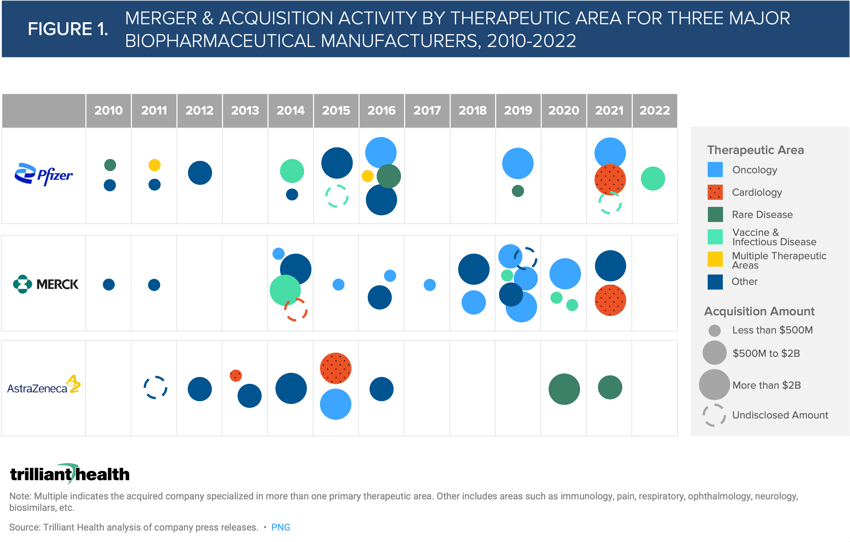 To better understand the longer-term M&A trends in the biopharmaceutical industry, we selected three major pharmaceutical companies with overlapping therapeutic areas of focus (e.g., cardiology, oncology and vaccines) – Merck, Pfizer, and AstraZeneca. To characterize the therapeutic areas these companies prioritized year-over-year, we analyzed acquisitions made by these companies between 2010 and 2022 using publicly available data sources (e.g., press releases).