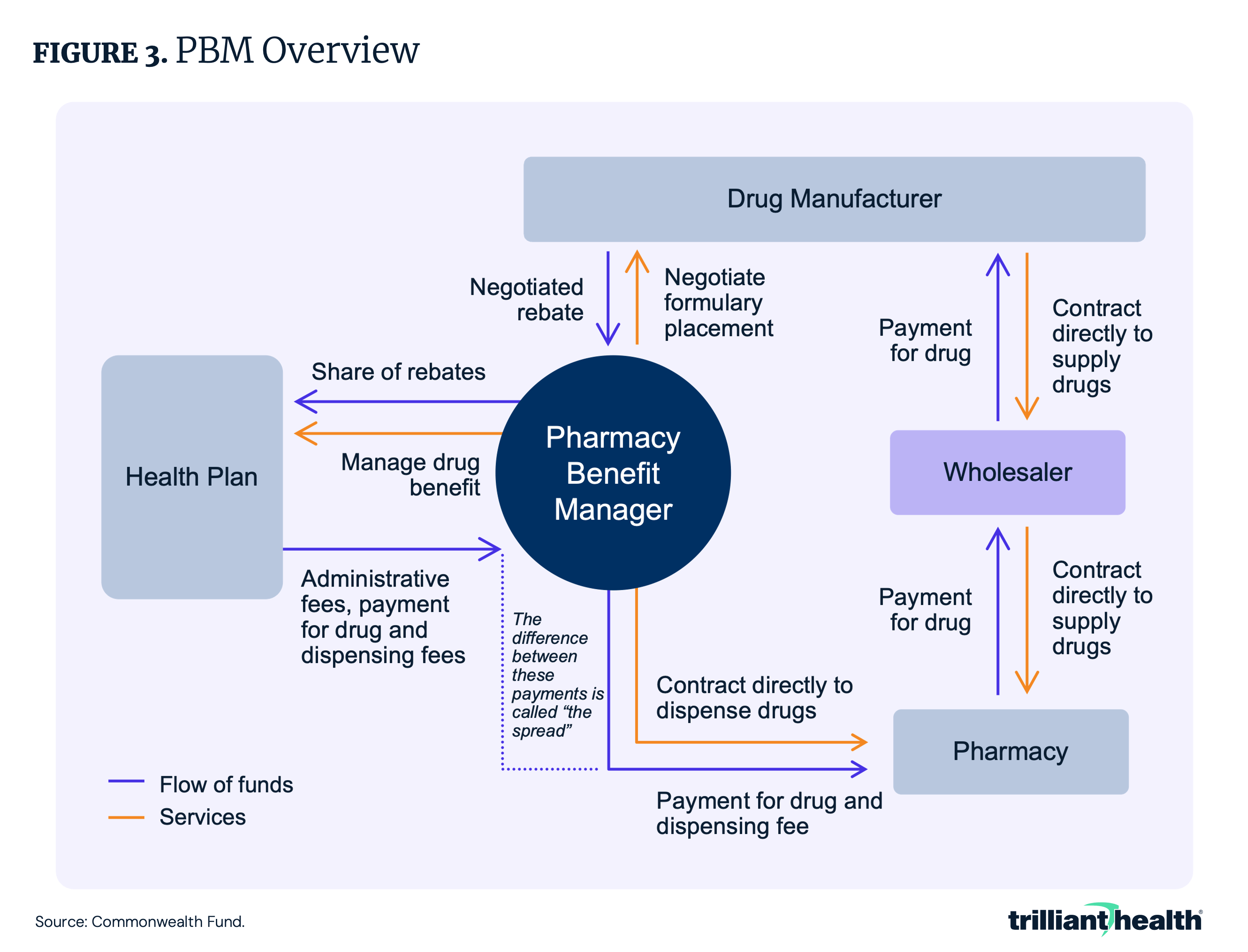 PBMs are third-party organizations that act as an intermediary between pharmacies, pharmaceutical manufacturers, plan sponsors (i.e., insurance companies and employers) and drug wholesalers (Figure 3). Over time, PBMs have significantly increased their role and influence within the pharmaceutical supply chain through a core set of services: utilization management (e.g., prior authorization, step therapy, quantity limits and drug utilization review), formulary development, price and rebate negotiation with pharmacies, wholesalers and manufacturers, pharmacy network management and mail-order pharmacy operations – often through vertically integrated services.3 This vertical integration means that PBMs not only design and manage drug benefits but also dispense medications through their affiliated mail-order and specialty pharmacies, allowing them to capture revenue at multiple stages of the drug distribution chain.