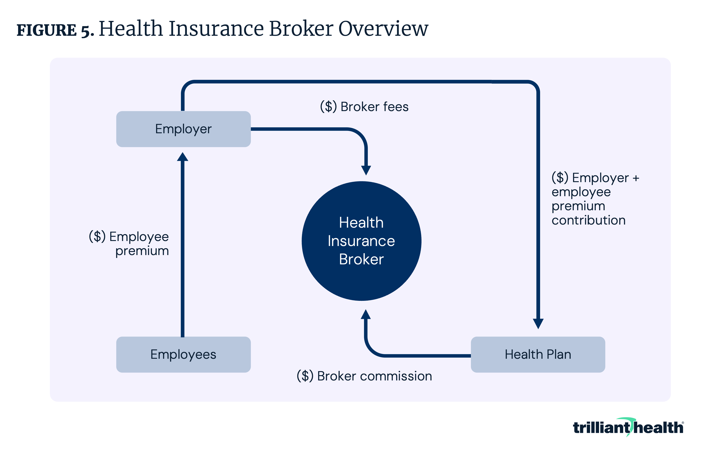 Health insurance brokers act as licensed intermediaries between health insurance companies and buyers such as employers, individuals and organizations, representing the customer rather than the health insurer (Figure 5). Brokers assess client needs, identify coverage options and negotiate plan terms with insurers, often assisting with enrollment, compliance with regulatory requirements and ongoing benefits management. Broker compensation is typically provided through commissions from insurers, though some brokers may also charge consulting fees.8 However, brokers can also introduce complexity and conflicts of interest, as their compensation structures may create incentives that do not always align with patient needs. Recent scrutiny of Medicare Advantage and Marketplace brokers has highlighted concerns about plan steering, unauthorized enrollments and the potential for financial arrangements that prioritize broker benefit over consumer choice.9,10