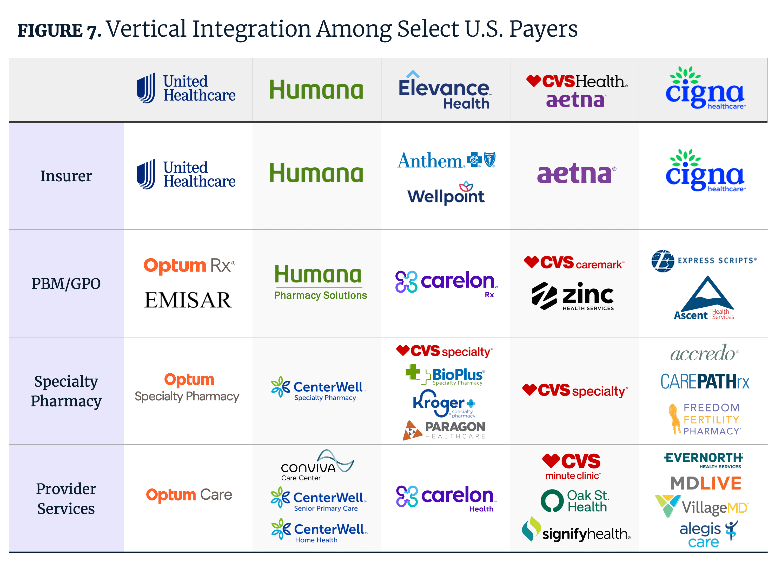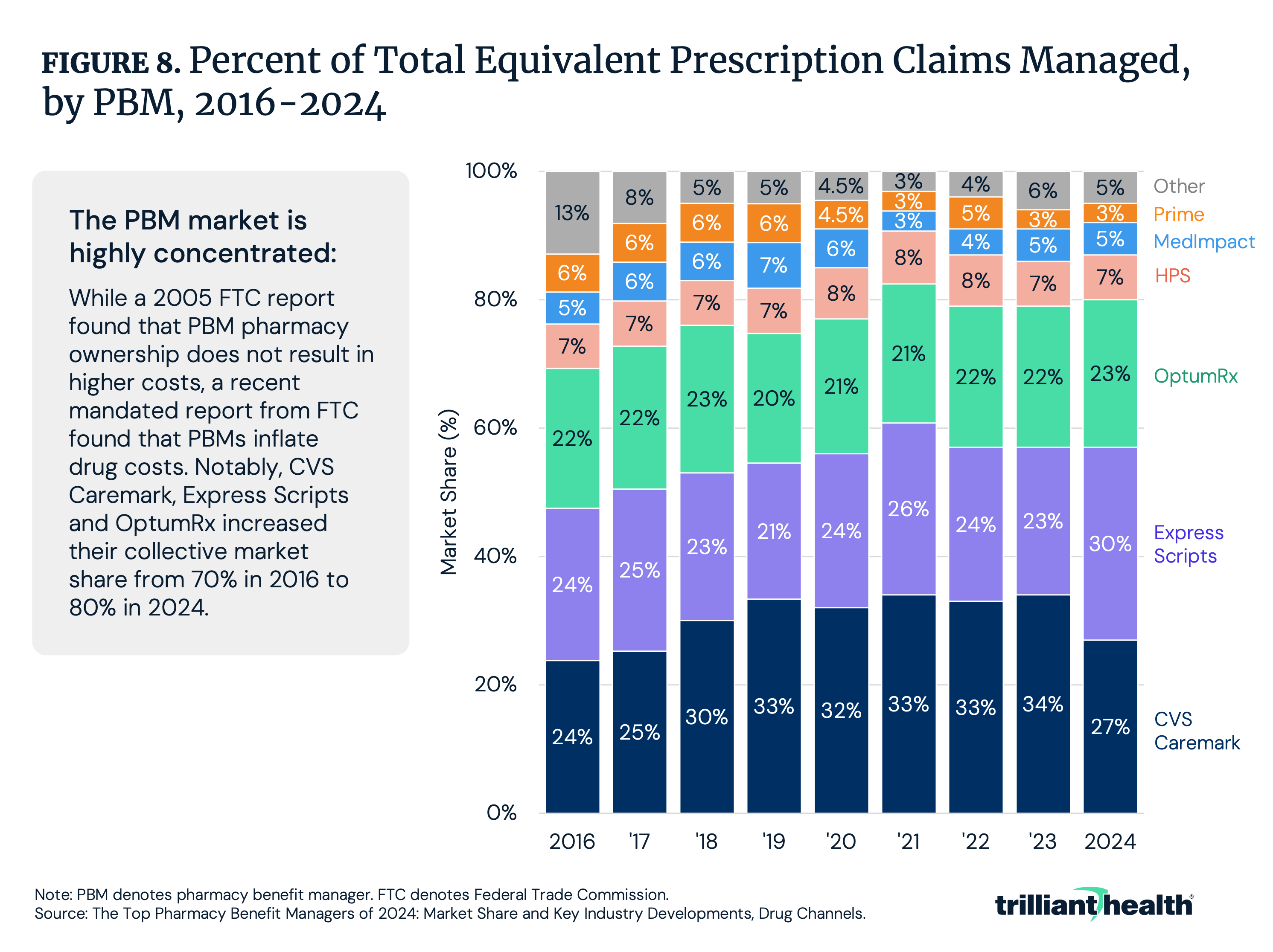Limited competition among PBMs has allowed six PBMs to account for 96% of prescription drug claims, with the three largest – CVS Caremark, LLC, Express Scripts, Inc. and OptumRx, Inc. – capturing 79% of market volume (Figure 7).23