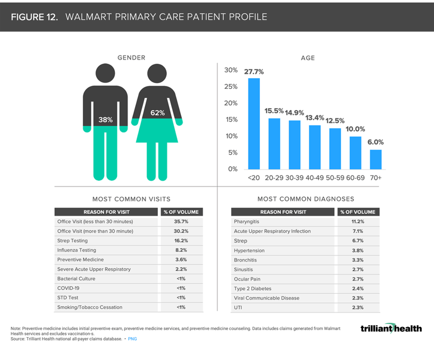 The entrance of retailers like Amazon, CVS, Walgreens, and Walmart in the healthcare market coupled with the evolving preferences of healthcare consumers for convenient and affordable care present notable challenges for traditional healthcare providers. The average patient seen by Walmart is 31 years old, which is 17.1 years younger than Walgreens and 7.5 years younger than CVS (Figure 12). Consistent with CVS and Walgreens, Walmart’s patient population is mostly female (62.4% female: 37.6% male). The reasons for seeking care at Walmart differ from both Walgreens and CVS patient panels. While preventive medicine accounts for double-digit amounts of volume at CVS and Walgreens (39.7% and 17.5%), preventive medicine at Walmart accounts for just 3.6% of volume, behind strep and influenza testing (16.2% and 8.2%).14,15,16