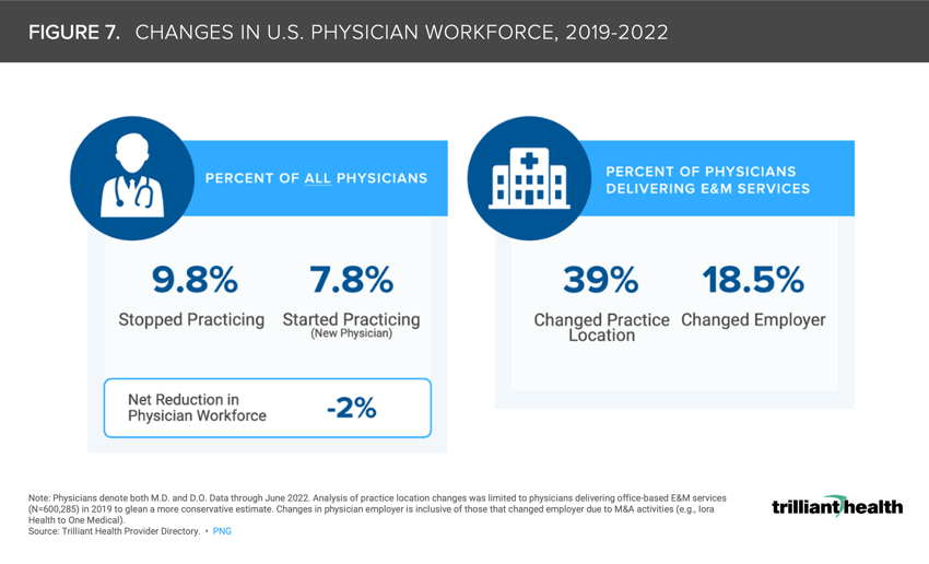 The net number of physicians starting and stopping practice from 2019 to 2022 resulted in a 2.0% workforce reduction (Figure 7). Among hospital physicians delivering evaluation and management (E&M) services, 18.5% of physicians changed employer organization or type (e.g., hospital, new entrant). The pandemic effect compounded with long-standing burnout resulted in 9.8% of physicians “retiring.”8