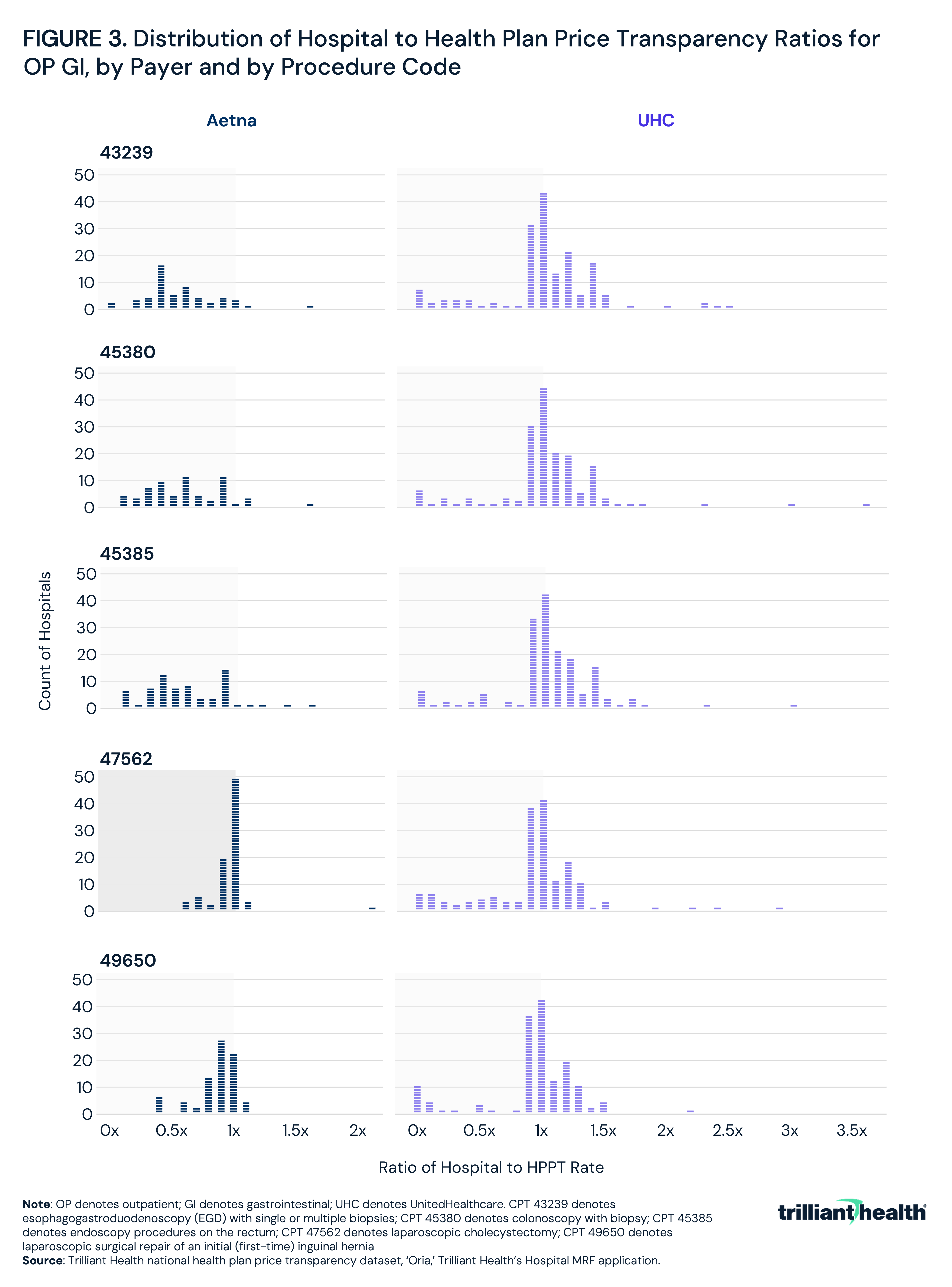 Like the inpatient MS-DRG codes, the disparity between HPPT-reported and hospital-reported commercial negotiated rates across the five outpatient GI surgery procedure codes analyzed ranged widely, with the direction and magnitude of discrepancy varying by payer and procedure type. For Aetna, HPPT rates were consistently higher than hospital-reported rates for the endoscopy codes, with hospital to HPPT ratios averaging 0.6 for CPT 43239 (esophagogastroduodenoscopy with biopsy), CPT 45380 (colonoscopy with biopsy) and CPT 45385 (colonoscopy with snare polypectomy). This indicates that HPPT rates were, on average, nearly twice the hospital-reported rate for these procedures (Figure 3). For CPT 47562 (laparoscopic cholecystectomy) and CPT 49650 (laparoscopic inguinal hernia repair), the average ratios were closer to parity at approximately 1.0 and 0.9, respectively. For UHC, average ratios were near or slightly above 1.0 for the endoscopy codes, and slightly below 1.0 for the laparoscopic codes. The largest single-hospital discrepancy where the HPPT rate was higher than the hospital rate occurred under Aetna for CPT 45380 under Aetna, with an observed difference of $11,001. The largest single-hospital discrepancy where the hospital rate was higher than the HPPT rate occurred under Aetna for CPT 47562 under UHC, with an observed difference of $31,048. Across all hospital-payer-procedure combinations, 10.8% had an exact match between the HPPT and hospital rate, and 41.7% were within a 0.9x to 1.1x range. However, 17.9% had a hospital to HPPT ratio of less than 0.5x or greater than 1.5x, indicating a significant discrepancy in rate information between the two sources for a meaningful share of observations.