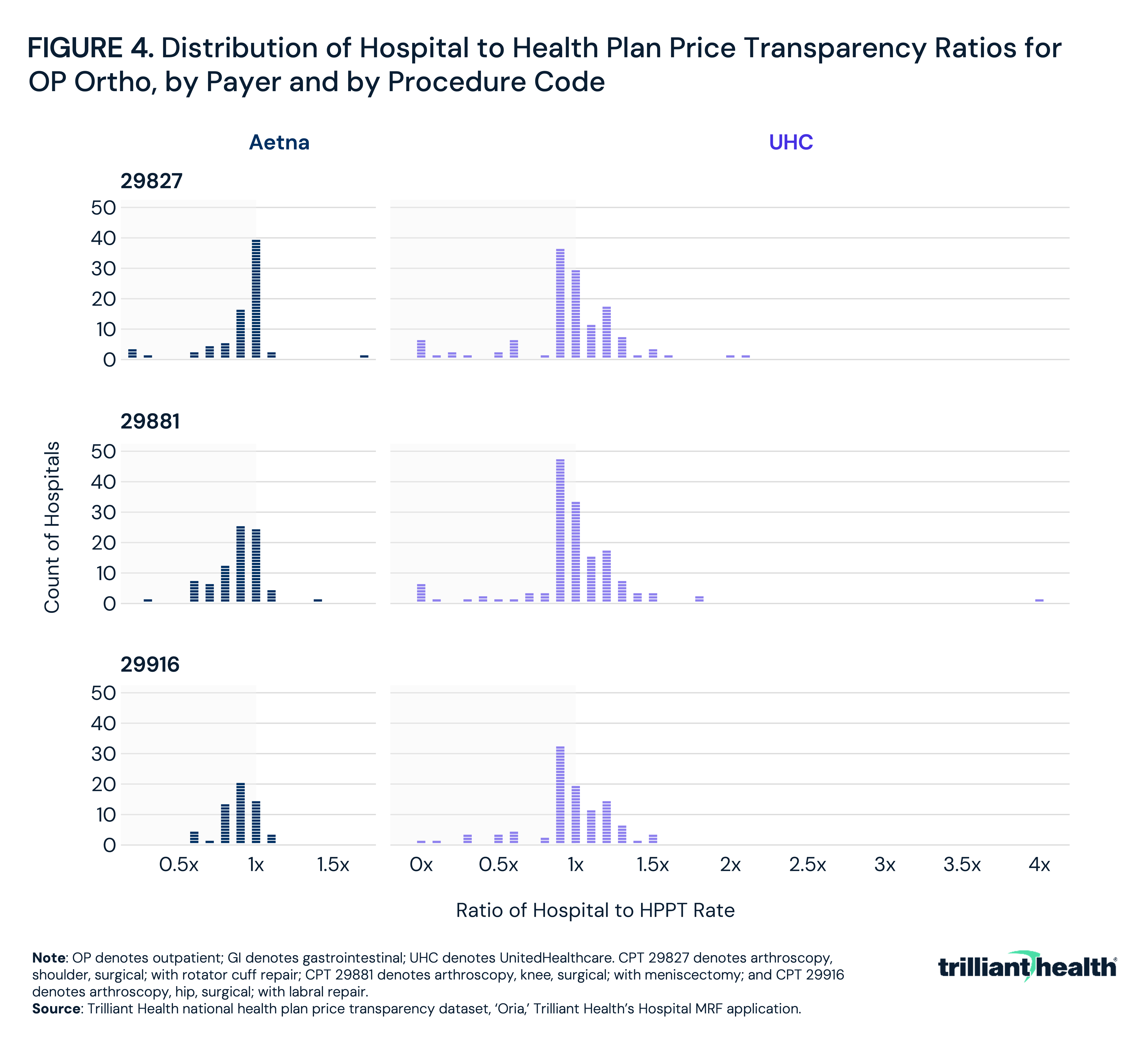 For Aetna, HPPT rates were on average higher than hospital-reported rates across all three codes, with an average hospital to HPPT ratio of 0.9 for each of CPT 29827 (arthroscopy, shoulder, surgical; with rotator cuff repair), CPT 29881 (arthroscopy, knee, surgical; with meniscectomy) and CPT 29916 (arthroscopy, hip, surgical; with labral repair), indicating that HPPT rates typically exceeded hospital-reported rates by 10% (Figure 4). For UHC, average ratios were between 0.9 and 1.0, though with considerably wider variation at the extremes. For Aetna, the largest single-hospital discrepancy was observed for CPT 29827, where the HPPT rate exceeded the hospital-reported rate by $12,275. For UHC, the widest gap was for CPT 29881, where one hospital-reported rate exceeded the corresponding HPPT rate by $20,367.