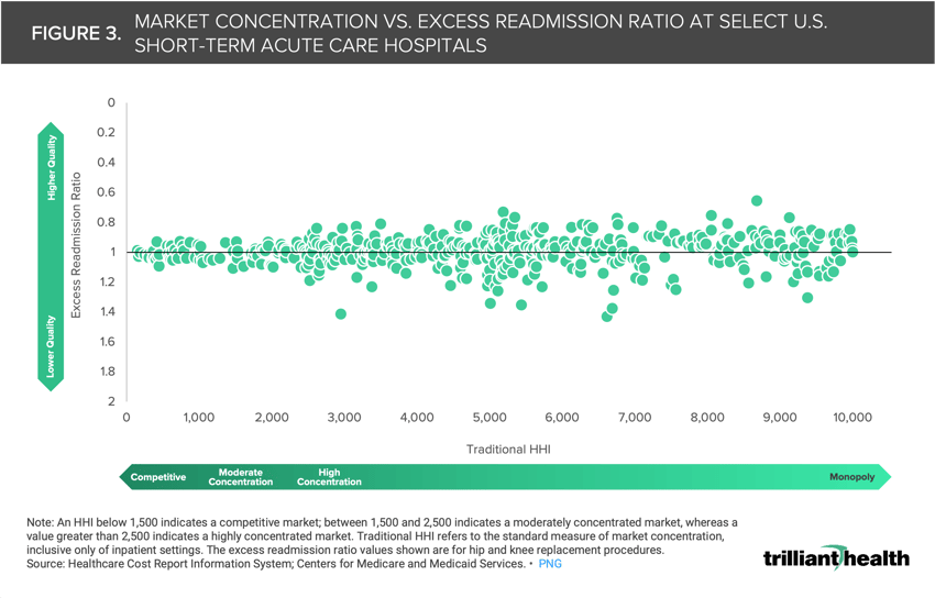 Another common misconception in healthcare is that market competition facilitates higher quality of care, based on the premise that those operating in competitive markets would be more incentivized to compete on quality in order to grow and maintain market share. However, the data reveal that competition is not necessarily indicative of quality. Using excess readmission ratio as a proxy for quality, the data show that the range of readmission rates does not substantially vary between HHI of 3,000 to 10,000 (Figure 3). In fact, many U.S. hospitals with low excess readmission ratios are in highly concentrated markets, perhaps suggesting that higher quality is associated with less competition for a limited supply of physicians and nurses. While in theory market competition could incentivize providers to compete on quality to increase patient retention and deliver on value in order to increase market share, the data suggests that quality is mixed – and relatively average – in every market.