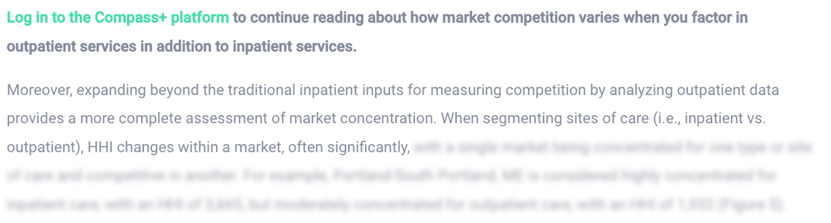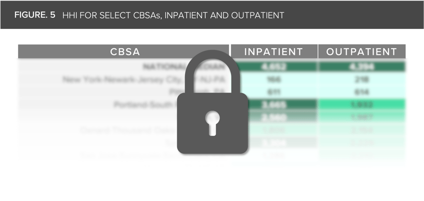 Moreover, expanding beyond the traditional inpatient inputs for measuring competition by analyzing outpatient data provides a more complete assessment of market concentration. When segmenting sites of care (i.e., inpatient vs. outpatient), HHI changes within a market, often significantly, with a single market being concentrated for one type or site of care and competitive in another. For example, Portland-South Portland, ME is considered highly concentrated for inpatient care, with an HHI of 3,665, but moderately concentrated for outpatient care, with an HHI of 1,932 (Figure 5).